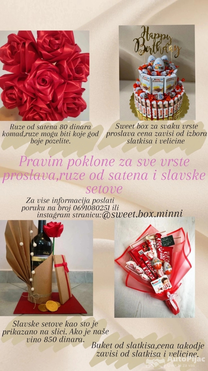 Pravim poklone za sve vrste proslava, ruze od satena u bilo kojoj boji i slavske setove.